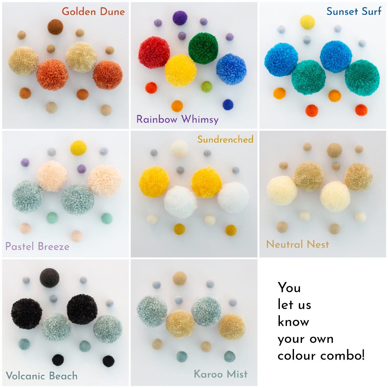 Colour palette applies to the felt balls and pom-poms